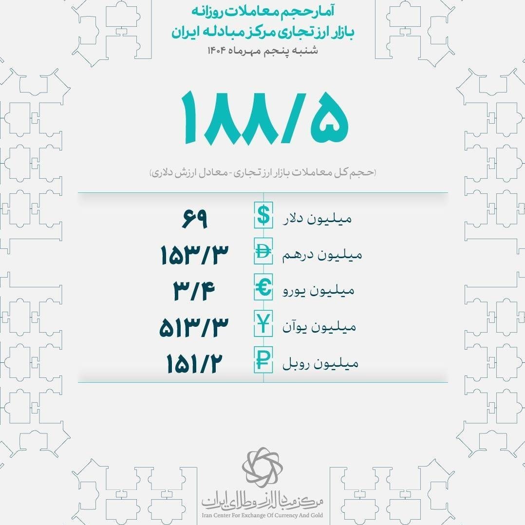 حجم کل معاملات این بازار از ابتدای سال 1404 تا پنجم مهرماه، به تفکیک نوع ارز هفت میلیارد و 825 میلیون دلار، 17 میلیارد و 964 میلیون درهم، 581 میلیون یورو، یک میلیارد روپیه، 104 میلیون وون، 6 میلیارد و 24 میلیون یوآن، 134 میلیون ین و 2 میلیارد و 245 میلیون روبل بوده است.