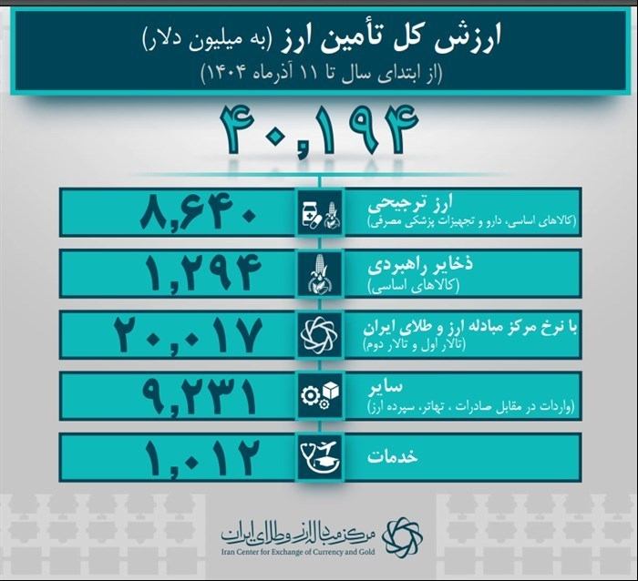 عصر اعتبار- از ابتدای سال جاری تا ۱۱ آذرماه در مجموع ۴۰ میلیارد و ۱۹۴ میلیون دلار برای نیازهای مختلف وارداتی کشور توسط بانک مرکزی تأمین ارز انجام شده است.