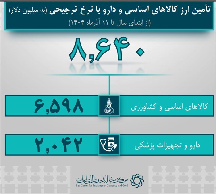 به گزارش پایگاه خبری «عصر اعتبار» به نقل از روابط عمومی بانک مرکزی از این میزان، 8 میلیارد و 640 میلیون دلار به واردات کالاهای اساسی و دارو شامل 6 میلیارد و 598 میلیون دلار برای نهاده‌ها و بخش کشاورزی و 2 میلیارد و 42 میلیون دلار برای واردات دارو و تجهیزات پزشکی تخصیص یافته است.