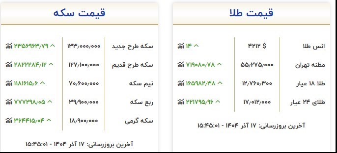 عصر اعتبار- روند افزایش قیمت طلا و مسکوکات آن روز دوشنبه - ۱۷ آذرماه - نیز در بازار تهران تداوم یافت و معامله گران هر سکه را ۱۳۳ میلیون تومان فروختند.