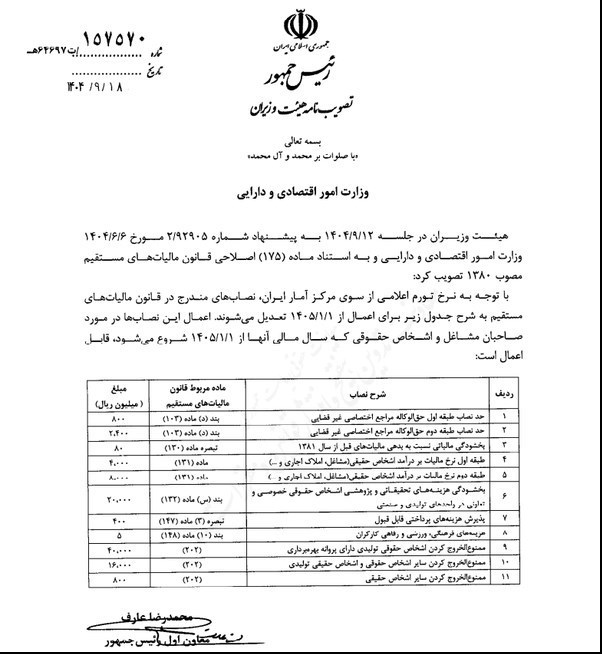بر اساس این مصوبه که به پیشنهاد وزارت امور اقتصادی و دارایی و در اجرای ماده (175) اصلاحی قانون مالیاتهای مستقیم به تصویب رسیده، حدود و نصابهای مختلف مالیاتی از ابتدای سال 1405 برای صاحبان مشاغل و اشخاص حقوقی لازمالاجرا خواهد بود.
