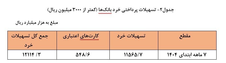 از کل تسهیلات پرداختی در دوره یاد شده، مبلغ 11565.7 هزار میلیارد ریال معادل 21.1 درصد به صورت تسهیلات خرد اعطا شده است. همچنین مبلغ 548.6 هزار میلیارد ریال نیز در قالب کارتهای اعتباری انجام پذیرفته است، که با احتساب این مبلغ، کل تسهیلات پرداختی خرد (کمتر از سه میلیارد ریال) به مبلغ 12114.3 هزار میلیارد ریال معادل 21.9 درصد کل تسهیلات پرداختی را شامل میشود. شایان ذکر است با توجه به اینکه تسهیلات پرداختی در قالب کارتهای اعتباری نیز در بخش خانوار پرداخت شده است، با این اوصاف سهم بخش خانوار از 23.9 درصد در جدول-1، به 24.6 درصد کل تسهیلات پرداختی افزایش مییابد.(جدول2)