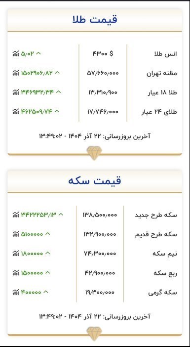 در معاملات امروز هر گرم طلای 18 عیار 13 میلیون و 310 هزار و 900 تومان و هر گرم طلای 24 عیار 17 میلیون و 746 هزار تومان نرخ گذاری شد که در طلای 18 عیار هر گرم حدود 346 هزار و 932 تومان و در طلای 24 عیار هر گرم حدود 462 هزار و 509 تومان نسبت به روز کاری گذشته افزایش قیمت را تجربه کرد.