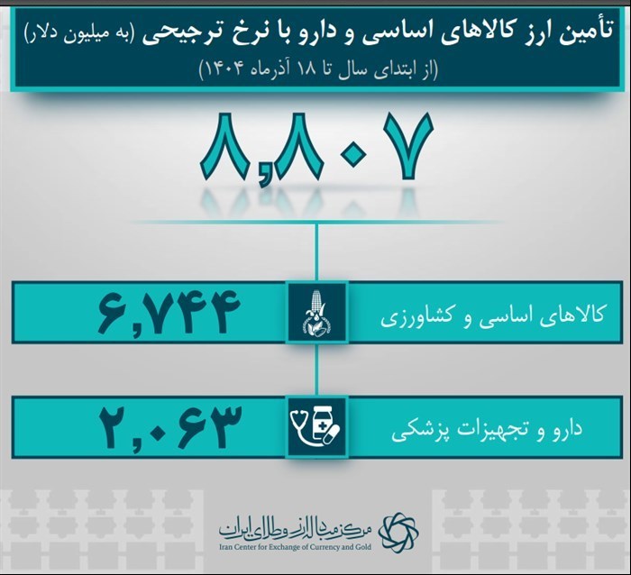 به گزارش پایگاه خبری «عصر اعتبار» به نقل از روابط عمومی بانک مرکزی از این میزان، 8 میلیارد و 807 میلیون دلار به واردات کالاهای اساسی و دارو شامل 6 میلیارد و 744 میلیون دلار برای نهادهها و بخش کشاورزی و 2 میلیارد و 63 میلیون دلار برای واردات دارو و تجهیزات پزشکی تخصیص یافته است.
