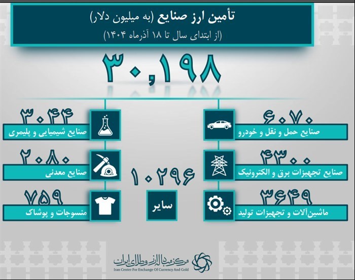 عصر اعتبار- از ابتدای سال جاری تا ۱۸ آذرماه در مجموع ۴۱ میلیارد و ۳۳۴ میلیون دلار برای نیازهای مختلف وارداتی کشور توسط بانک مرکزی تأمین ارز انجام شده است که بیش از ۳۰ میلیارد دلار مربوط به صنایع است.