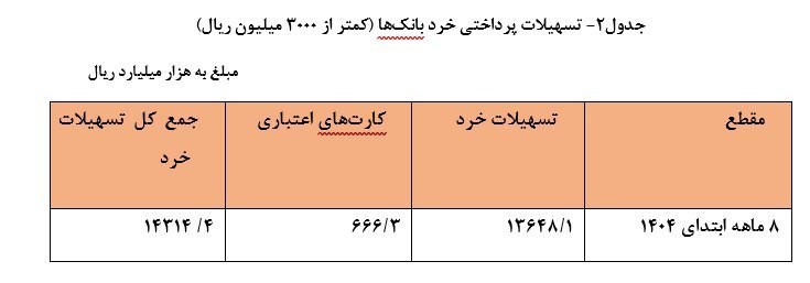 از کل تسهیلات پرداختی در دوره یاد شده، مبلغ 13648.1 هزار میلیارد ریال معادل 21.7 درصد به صورت تسهیلات خرد اعطا شده است. همچنین مبلغ 666.3 هزار میلیارد ریال نیز در قالب کارت‌های اعتباری انجام پذیرفته است، که با احتساب این مبلغ، کل تسهیلات پرداختی خرد (کمتر از سه میلیارد ریال) به مبلغ 14314.4 هزار میلیارد ریال معادل 22.5 درصد کل تسهیلات پرداختی را شامل می‌شود. شایان ذکر است با توجه به اینکه تسهیلات پرداختی در قالب کارت‌های اعتباری نیز در بخش خانوار پرداخت شده است، با این اوصاف سهم بخش خانوار از 24.6 درصد در جدول‏-1، به 25.4 درصد کل تسهیلات پرداختی افزایش می‌یابد.(جدول2)