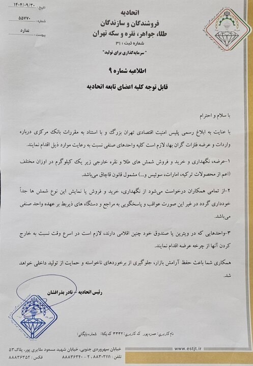 در این اطلاعیه آمده است: با عنایت به ابلاغ رسمی پلیس امنیت اقتصادی تهران بزرگ و با استناد به مقررات بانک مرکزی درباره واردات و عرضه فلزات گران بها لازم است کلیه واحدهای صنفی نسبت به رعایت موارد ذیل اقدام نمایند.