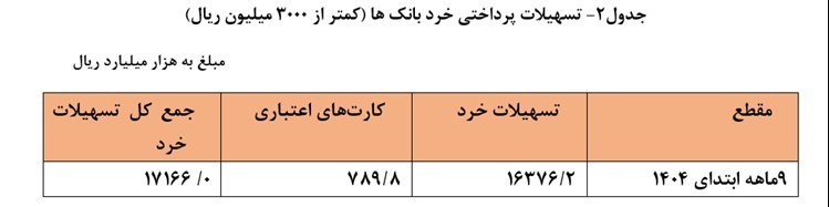 از کل تسهیلات پرداختی در دوره یاد شده، مبلغ 16376.2 هزار میلیارد ریال معادل 22.0 درصد به صورت تسهیلات خرد اعطا شده است. همچنین مبلغ 789.8 هزار میلیارد ریال نیز در قالب کارتهای اعتباری انجام پذیرفته است، که با احتساب این مبلغ، کل تسهیلات پرداختی خرد (کمتر از سه میلیارد ریال) به مبلغ 17.166.0 هزار میلیارد ریال معادل 22.8 درصد کل تسهیلات پرداختی را شامل میشود. شایان ذکر است با توجه به اینکه تسهیلات پرداختی در قالب کارتهای اعتباری نیز در بخش خانوار پرداخت شده است، با این اوصاف سهم بخش خانوار از 25.7 درصد در جدول-1، به 26.4 درصد کل تسهیلات پرداختی افزایش مییابد.(جدول2)