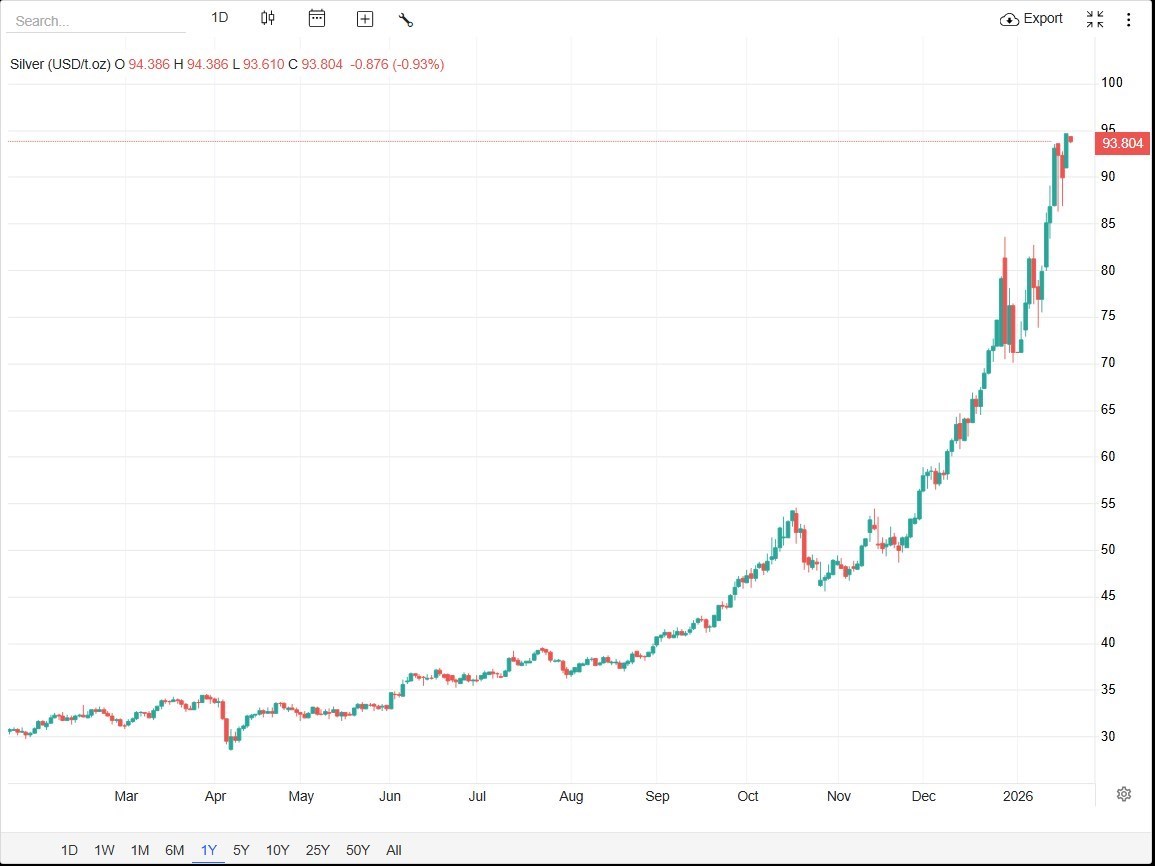 به گزارش پایگاه خبری «عصر اعتبار» به نقل از مهر، قیمت نقره روز سهشنبه 30 دی 1404، پس از ثبت سقف تاریخی 95 دلار و 11 سنتی در معاملات بعد از ظهر امروز که در پی تشدید تنشهای تجاری میان آمریکا و اروپا رخ داد، اکنون با عقب نشینی جزئی و با افت 0.9 درصدی در محدود کمتر از 94 دلار به ازای هر اونس معامله میشود.