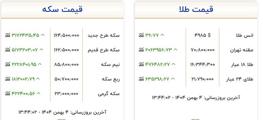 در بازار مسکوکات طلا نیز قیمت هر قطعه سکه تمام با 3 میلیون و 172 هزار و 435 تومان افزایش به 164 میلیون و 500 هزار تومان رسید و هر قطعه سکه قدیم نیز با 5 میلیون و 173 هزار و 203 تومان رشد قیمت، 162 میلیون و 500 هزار تومان به فروش رفت.