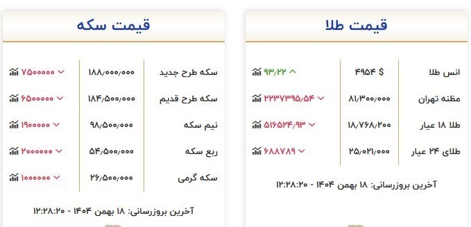 در بازار مسکوکات طلا نیز هر قطعه سکه تمام با کاهش 7 میلیون و 500 هزار تومانی، 188 میلیون تومان، سکه تمام طرح قدیم با کاهش 6 میلیون و 500 هزار تومان 184 میلیون و 500 هزار تومان و نیم سکه با کاهش یک میلیون و 900 هزار تومانی 98 میلیون و 500 هزار تومان به فروش رفت.