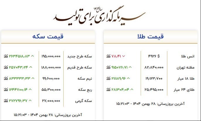 در بازار سکه، هر قطعه سکه تمام با رشد 2 میلیون و 634 هزار تومانی 195 میلیون تومان، سکه تمام طرح قدیم با 2 میلیون و 570 هزار تومان رشد 188 میلیون تومان، نیم سکه با 833 هزار تومان افزایش 99 میلیون و 600 هزار تومان و ربع سکه با رشد یک میلیون و 244 هزار تومانی 55 میلیون و 300 هزار تومان فروخته شد.