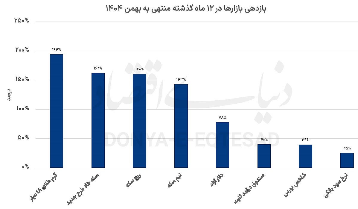 در بهمنماه، گرم طلای 18 عیار با ثبت بازدهی 30.8درصدی در صدر بازارها ایستاد. پس از آن، سکه طلای طرح جدید با 28 درصد، نیمسکه با 25.4 درصد و ربعسکه با 19.4 درصد بیشترین بازدهی را به خود اختصاص دادند. دلار آزاد نیز رشد 17.7درصدی را تجربه کرد که اگرچه کمتر از بازدهی بازار سکه بود، اما همچنان در زمره داراییهای پربازده ماه قرار گرفت. در مقابل، صندوقهای درآمد ثابت با 3.3 درصد و نرخ سود بانکی با حدود 2 درصد بازدهی، عملکردی محدود و متناسب با ماهیت کمریسک خود داشتند. شاخص بورس تنها بازاری بود که در این ماه بازدهی منفی 15.5 درصدی را ثبت کرد و بهعنوان بازنده اصلی بهمن شناخته شد.