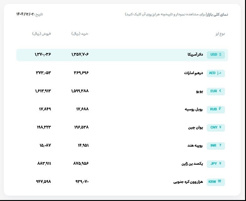به گزارش پایگاه خبری «عصر اعتبار» به نقل از ایلنا، امروز شنبه 2 اسفند ماه 1404، قیمت فروش حواله دلار آمریکا در مرکز مبادله ارز و طلای ایران 137 هزار 3 تومان و قیمت خرید حواله دلار 135 هزار و 770 تومان است.