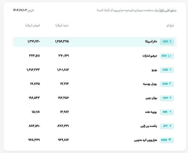به گزارش پایگاه خبری «عصر اعتبار» به نقل از ایبنا، امروز یکشنبه 3 اسفند ماه 1404، قیمت فروش حواله دلار آمریکا در مرکز مبادله ارز و طلای ایران 137 هزار 173 تومان و قیمت خرید حواله دلار 135 هزار و 937 تومان است.