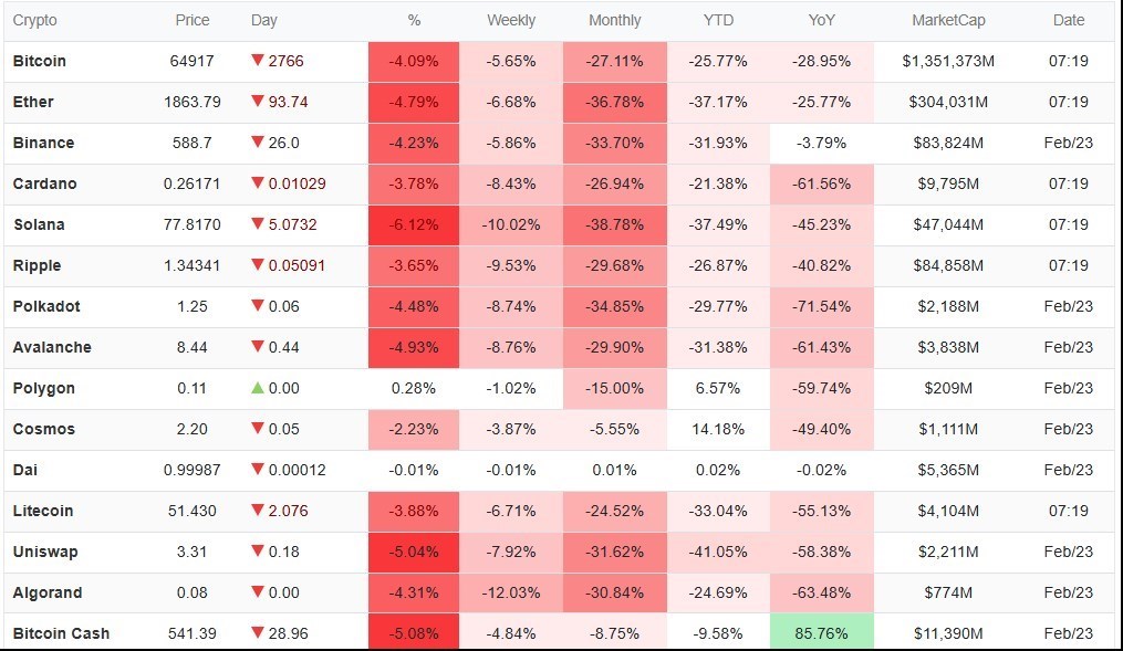 عصر اعتبار- بازار رمزارزها در ۴ اسفند ۱۴۰۴ قرمزپوش شد؛ بیت‌کوین با سقوط ۴ درصدی به ۶۴,۹۳۹ دلار رسید و سولانا با ریزش ۶.۲ درصدی سنگین‌ترین ضرر را ثبت کرد.